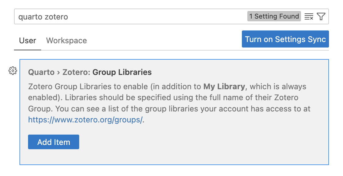 If you are using VS Code in a web browser and/or don’t have Zotero installed locally, you can still access your Zotero library using the Zotero Web API (assuming you have a Zotero web account and have synced your libraries to your account).